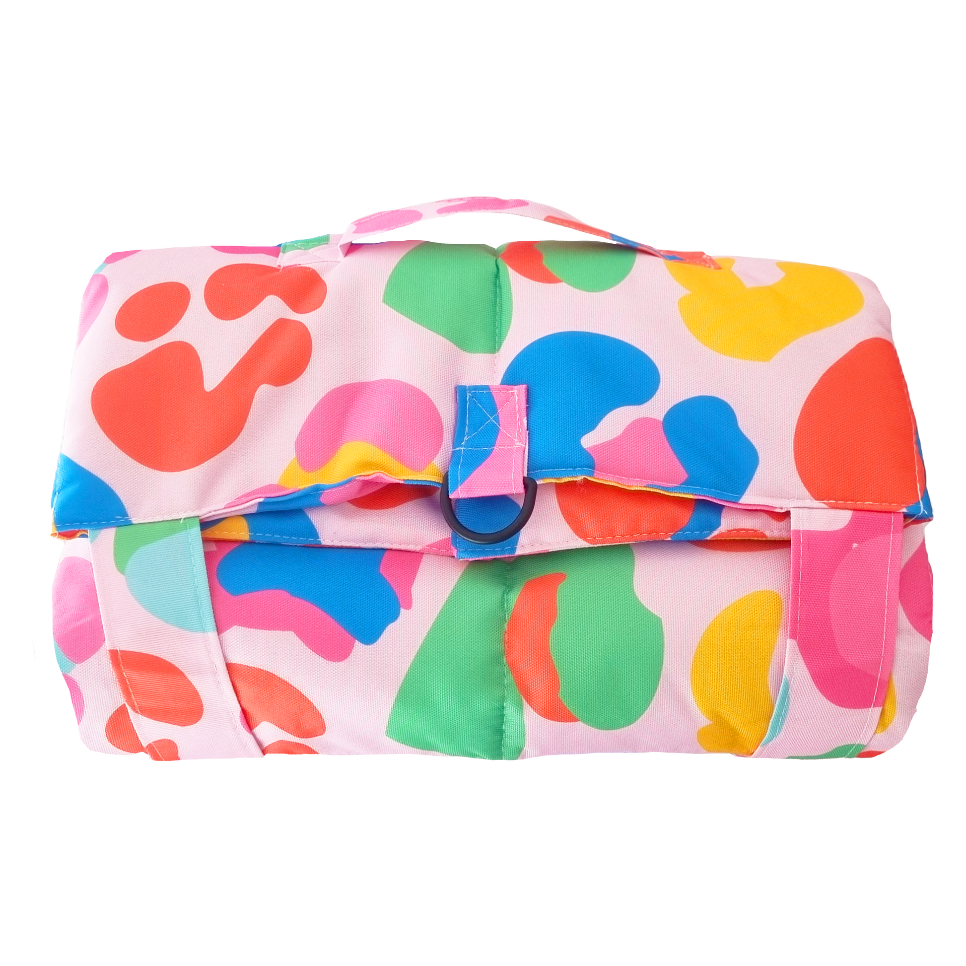 Our adventure mats can easily fold up and be secured in place with the velcro straps. Its lightweight and easy to grip handle also allows you to easily carry the mat to and from your fur babies outdoor activities.