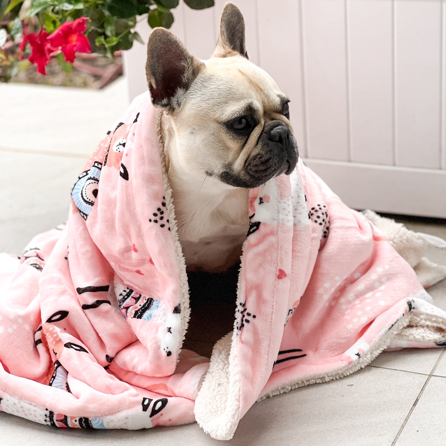 - Printed Minky Flannel on one side & Cream Sherpa on the opposite side