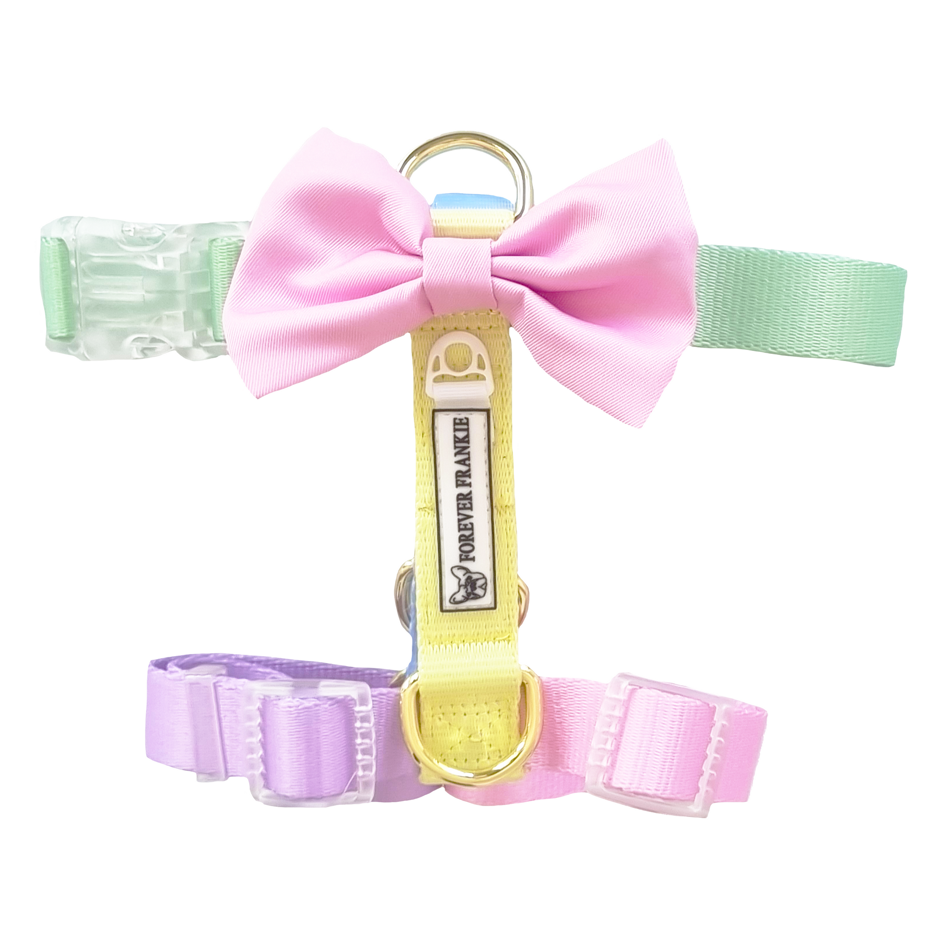 Dress up any collar or harness with our elastic bow ties. This Bow tie goes perfectly with our Pastel Rainbow and our Pastel Pink / Lavender Luxe Harness or on a collar